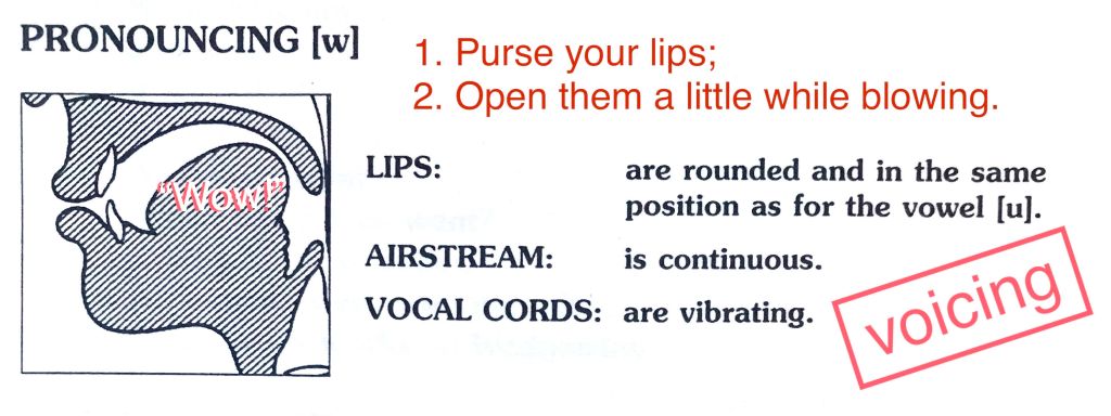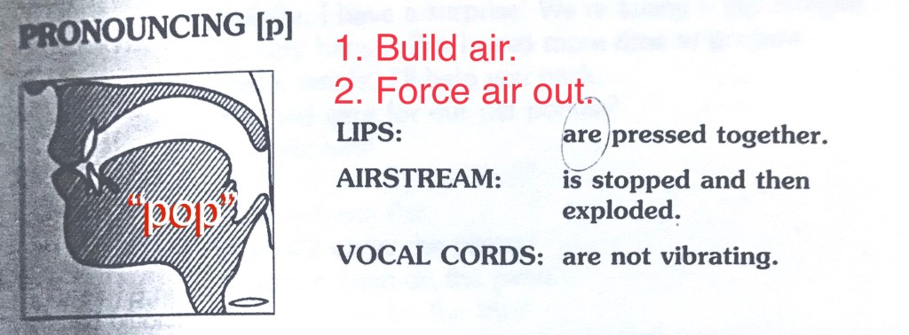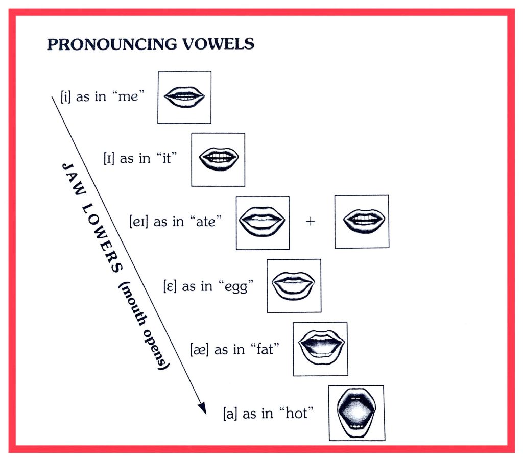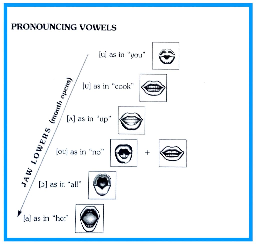 The uniform illustrations on this page have been provided with apologies and thanks to Paulette Dale and Lillian Poms from a book I started using in the 1998, in Princeton, New Jersey–at Inlingua School of Languages (see resume, references), in Korea called English Pronunciation for International Students, published by Prentice Hall. These days one can find countless pronunciation videos on You Tube, but I find a simple diagram like the ones featured here are instrumental in envisioning and remembering the placement of the tongue and the shape of the lips necessary to the pronouncement of sounds in the English language.